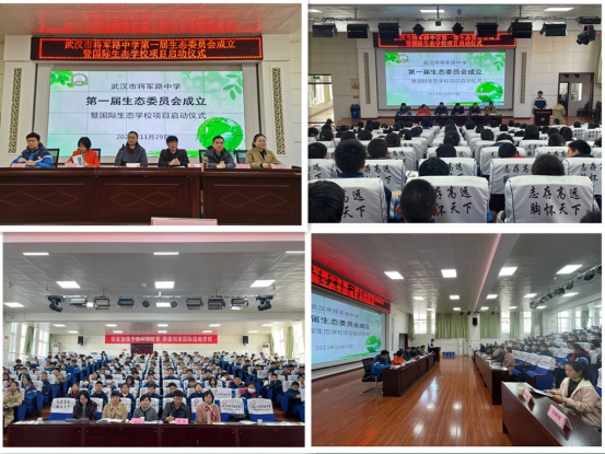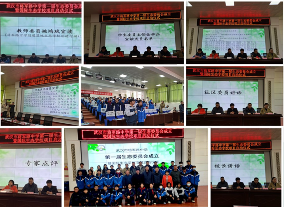 2023年11月29日上午,武汉市将军路中学第一届生态委员会成立暨国际生态公司项目启动仪式在将军路中学报告厅举行。东西湖区教育局普教科林嘉主任、将北社区党委书记李辉主任,beat365体育官网委托管理团队李经天教授、杨红云副教授、于洋副教授、鲁婷副教授、肖凯博士、罗淑娟博士、湖北省未成年人生态道德教育分会会长程慧主任到会祝贺。将军路中学领导赵群立、王朝英、舒敏等参加会议,生态委员会全体员工委员、教师委员、家长委员和员工代表200多人出席了启动仪式。