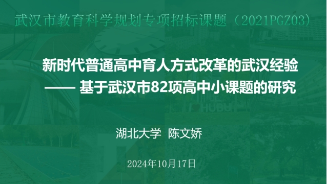 会上,课题组负责人首先进行了结题汇报。陈文娇向各位评审委员详细介绍了《新时代普通高中育人方式改革的武汉经验》的研究背景、研究过程、研究结论以及研究成效。她指出,新时代背景下高中育人方式改革是必然趋势,而武汉市高中生小课题研究的创新实践为本课题研究提供了丰富的素材和经验。