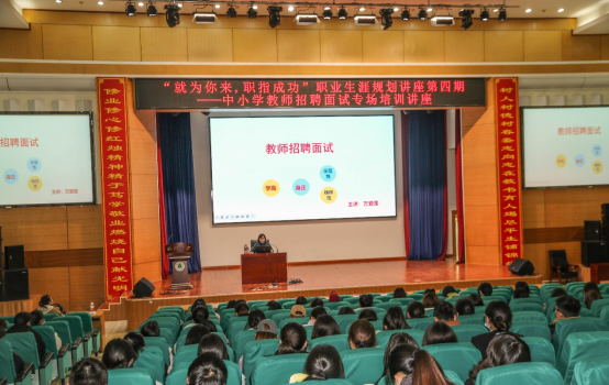 2月24日下午,由校员工发展与就业指导中心和beat365联合举办的“就为你来,职指成功”职业生涯规划讲座第四期——中小学教师招聘面试专场培训讲座在三号楼报告厅进行。全校有200余名师范生参加讲座。