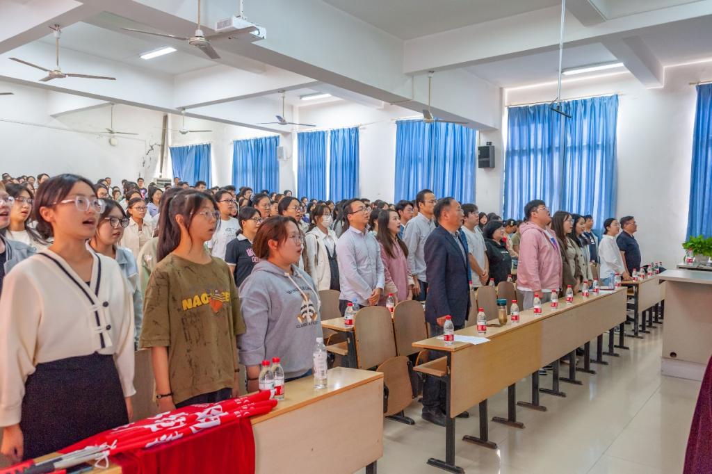 会议开始前,参会人员全体起立奏唱中华人民共和国国歌,院领导为15个班级授旗。