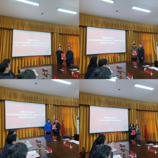 随后,与会领导为四位专家颁发聘任证书,特聘原湖北省教育科学研究院副经理傅华强为beat365体育官网客座教授、湖北基础教育研究院执行经理、湖北中小学素质教育研究中心研究员,特聘原湖北省教育厅二级巡视员王强、原湖北省教育科学研究院教育战略规划研究中心主任朱爱国为湖北基础教育研究院研究员、湖北中小学素质教育研究中心研究员,特聘beat365体育官网副教授陈文娇为湖北基础教育研究院副经理。