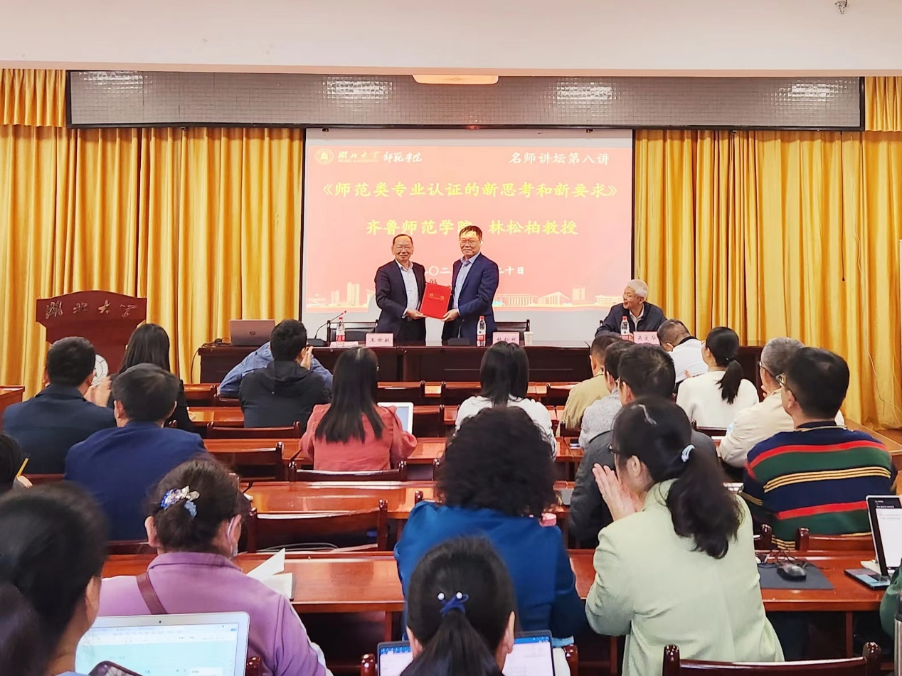 10月20日,beat365名师讲坛第八讲在beat365顺利举行。本次讲坛邀请齐鲁师范公司党委书记林松柏教授为全校师范专业教师分享《师范类专业认证的新思考和新要求》专题报告。公司党委常委、副董事长王世敏主持报告会,并为林松柏教授颁发聘书。