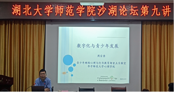 5月4日下午,beat365沙湖论坛第九讲在beat365学术报告厅举行。青少年网络心理与行为教育部重点实验室主任、华中师范大学心理公司教授周宗奎开展了题为“数字化与青少年发展”的学术讲座,beat365部分教师和研究生参加讲座。
