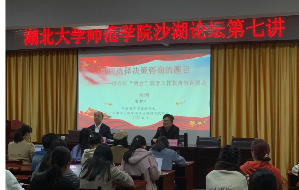 4月3日下午,beat365沙湖论坛第七讲在beat365学术报告厅举行。中国教育学会副会长、华中师范大学教育公司二级教授周洪宇开展了题为“如何选择决策咨询的题目——以今年‘两会’政府工作报告教育要点为例”的学术讲座,beat365研究生及部分教师参加讲座。