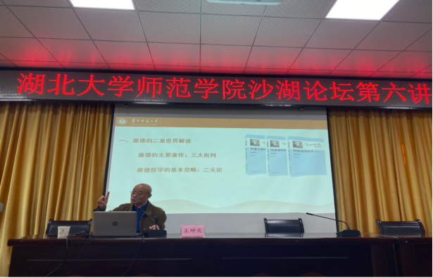 讲座伊始,王坤庆教授对康德这位划时代的伟大哲学家进行追溯,解读了康德的二重世界。他讲授了康德哲学的基本范畴:二元论,即自然世界和精神世界的二元结构。王教授指出教育不仅是教会人会生产、会生活,也要使其成为有个性、有理想、有精神之人。他认为康德哲学的主要贡献是人的自由贯穿于人所在的二重世界,自由之于物质世界,自由之于精神世界,人既是教育的结果,也是通过教育追求精神世界使人真正成为完人的过程。